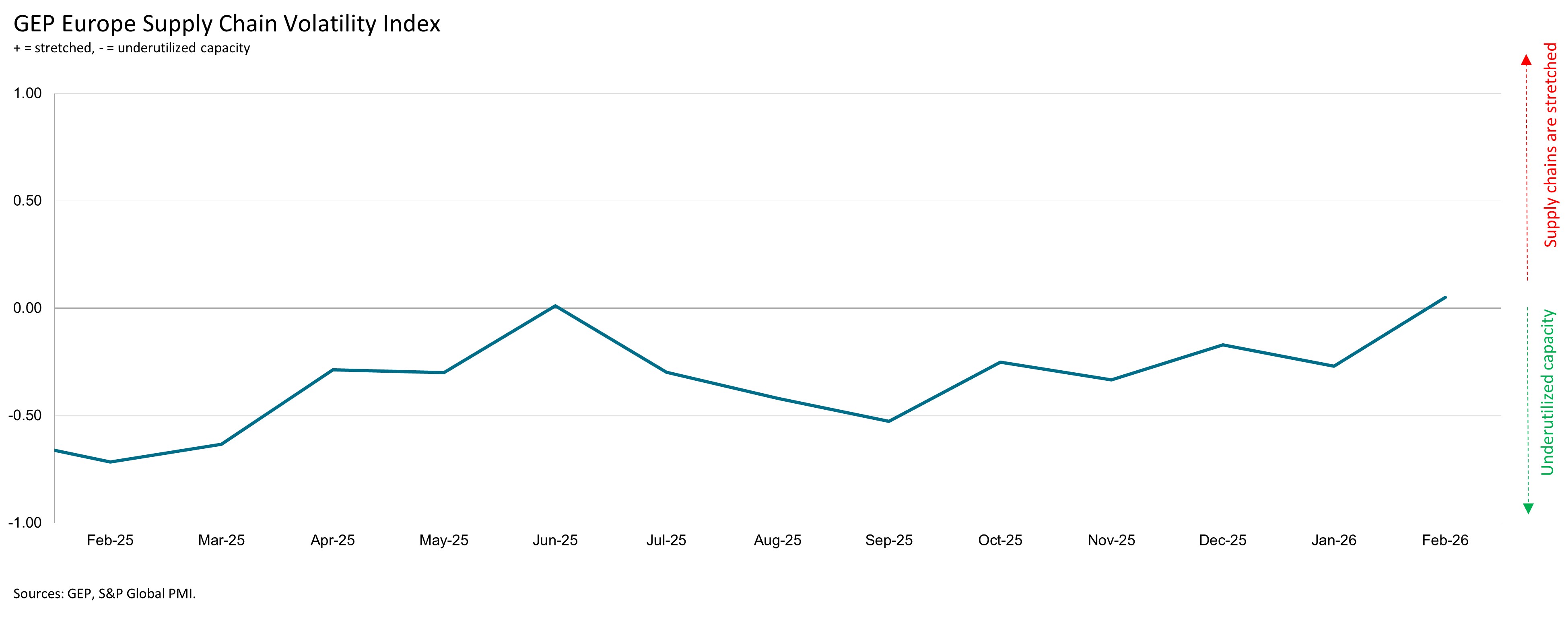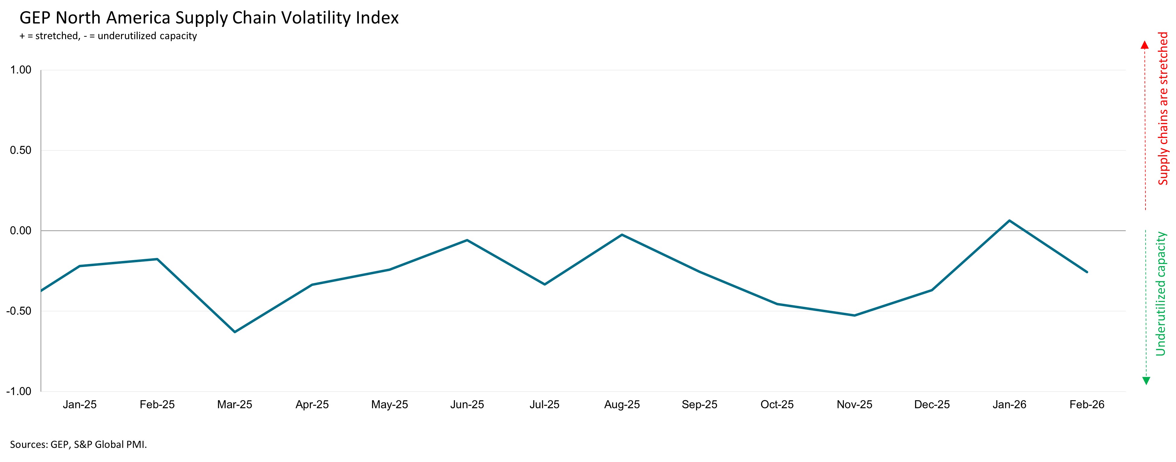 A value below 0 indicates that supply chain capacity is being underutilized, reducing supply-chain volatility. The further below 0, the greater the extent to which capacity is being underutilized.