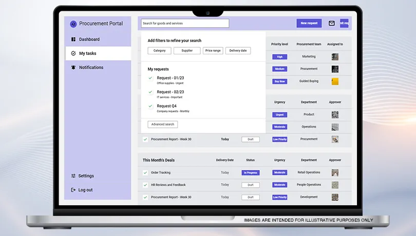 The portal's self-service feature lets users customize their procurement experience with relevant documents and processes. Teams can filter content by categories and sub-functions while maintaining compliance with enterprise policies and procedures across all business units.