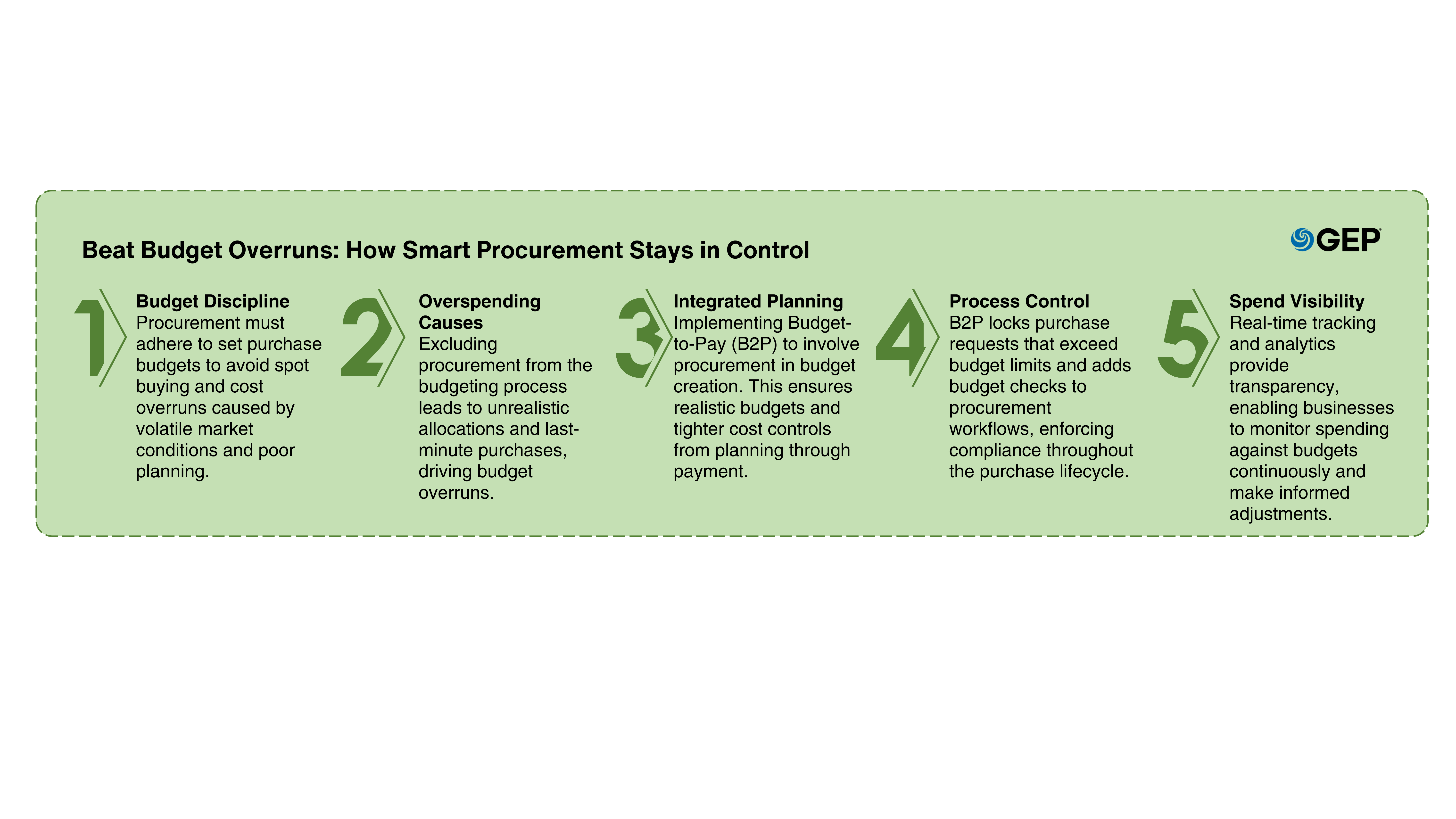 Unlike the S2P value chain where decisions are based on the availability of budgets, controls are set up in the procure-to-order process in a B2P setting. Budget checks are added to existing controls such as contract compliance. This increases the possibility of finance setting an optimum purchase budget that is sufficient to meet varied purchase requirements.