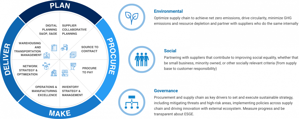 - Integre la sostenibilidad en los cuatro pilares de la cadena de suministro: planificar, adquirir, fabricar y suministrar