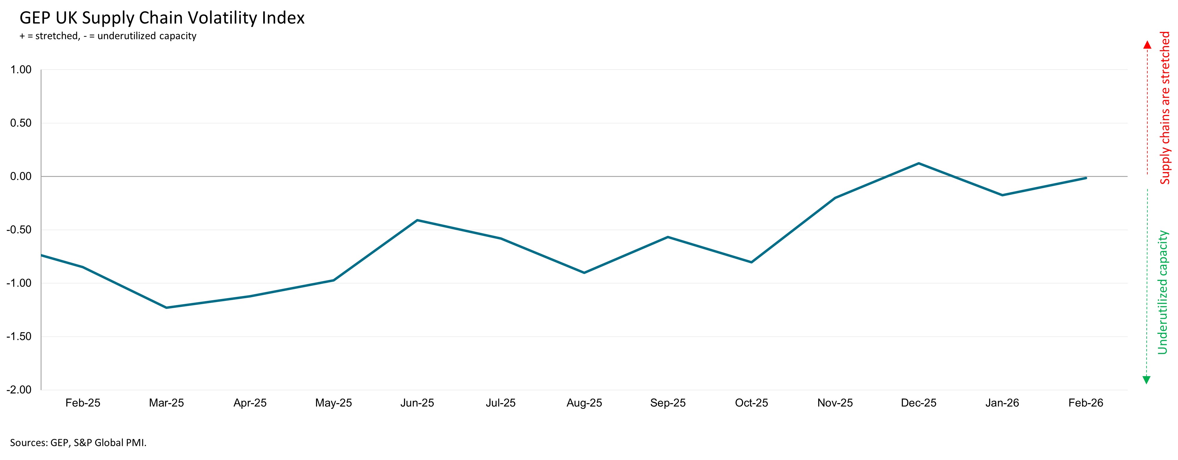 A value below 0 indicates that supply chain capacity is being underutilized, reducing supply-chain volatility. The further below 0, the greater the extent to which capacity is being underutilized.
